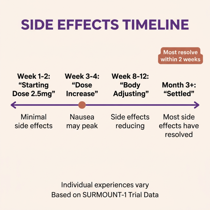 In Eli Lilly’s SURMOUNT-1 trial, the most common side effects were gastrointestinal, occurring primarily during dose escalation—when your dose increases from 2.5mg to 5mg, then 7.5mg, and beyond.