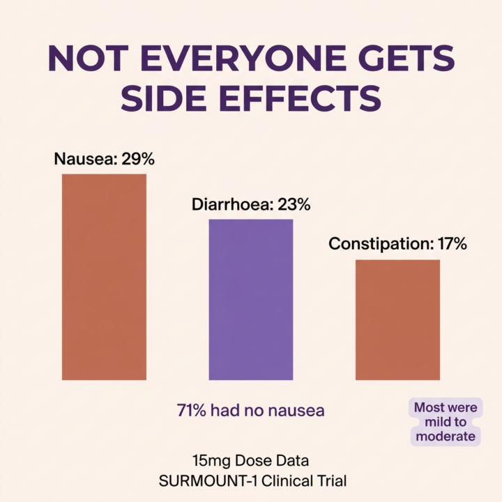 Important context: These percentages represent all severity levels reported in clinical trials. In SURMOUNT-1, most gastrointestinal side effects were classified as mild to moderate. Severe gastrointestinal side effects leading to treatment discontinuation occurred in less than 5% of trial participants.