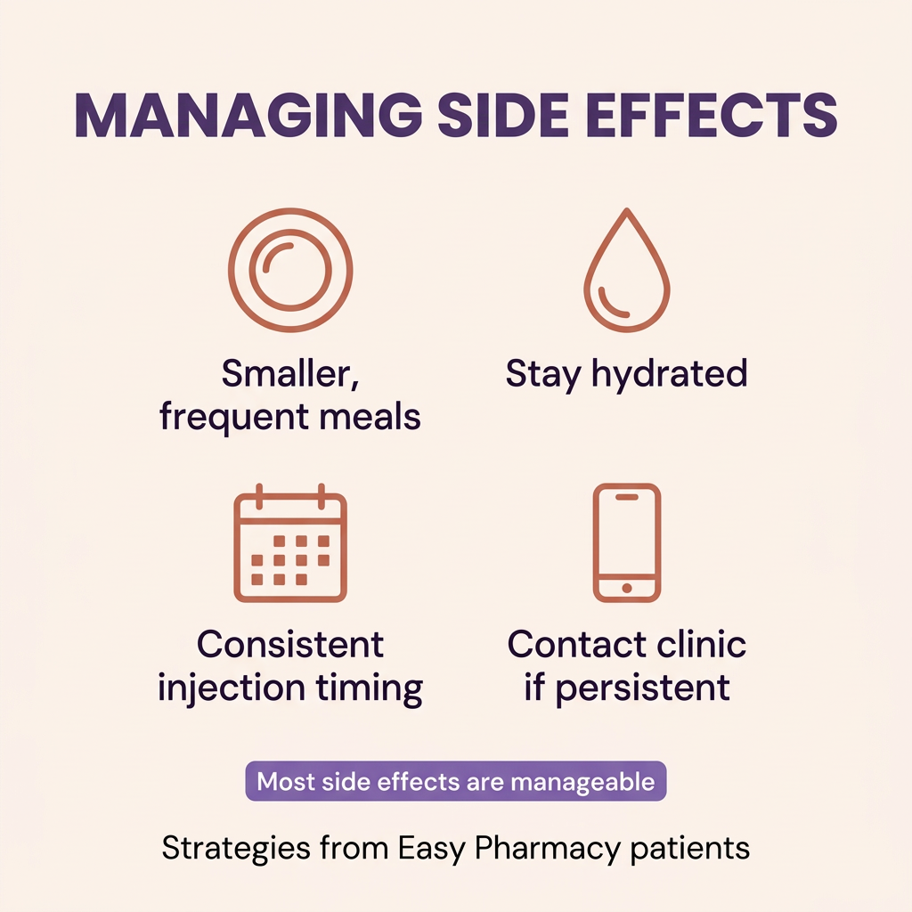 Yes, many patients successfully manage Mounjaro nausea without discontinuing treatment. In clinical trials, severe nausea leading to treatment discontinuation occurred in less than 5% of patients. Strategies that patients report helpful include: eating smaller, more frequent meals rather than large portions; avoiding high-fat foods during the first few weeks; staying well hydrated; and timing your injection consistently so you can anticipate when side effects might peak. At Easy Pharmacy’s monthly reviews, we assess your nausea severity and can discuss whether staying at your current dose temporarily, rather than escalating, might help your body adjust. If nausea is preventing adequate food or fluid intake between appointments, contact us for an earlier review.