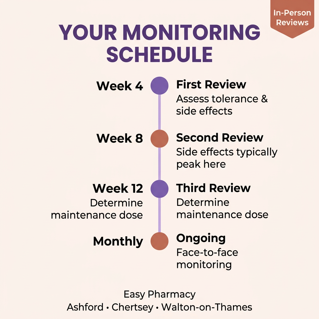 At Easy Pharmacy, serving patients across Ashford, Chertsey, and Walton-on-Thames, we provide face-to-face appointments at your monthly review to assess your individual response: how you’re tolerating the medication, what side effects you’re experiencing if any, and whether dose adjustment should be considered.
