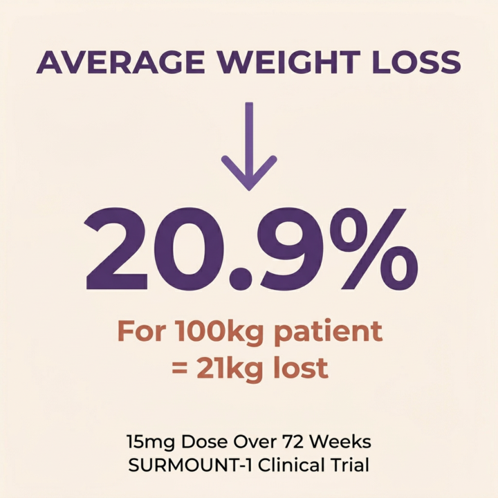 SURMOUNT-1 studied adults with obesity or who were overweight without diabetes over 72 weeks. Participants on the 15mg dose lost an average of 20.9% of their body weight. For someone starting at 100kg, that’s over 20kg lost. More importantly, 91% of participants on Mounjaro lost at least 5% of their body weight, and 57% lost at least 20%.