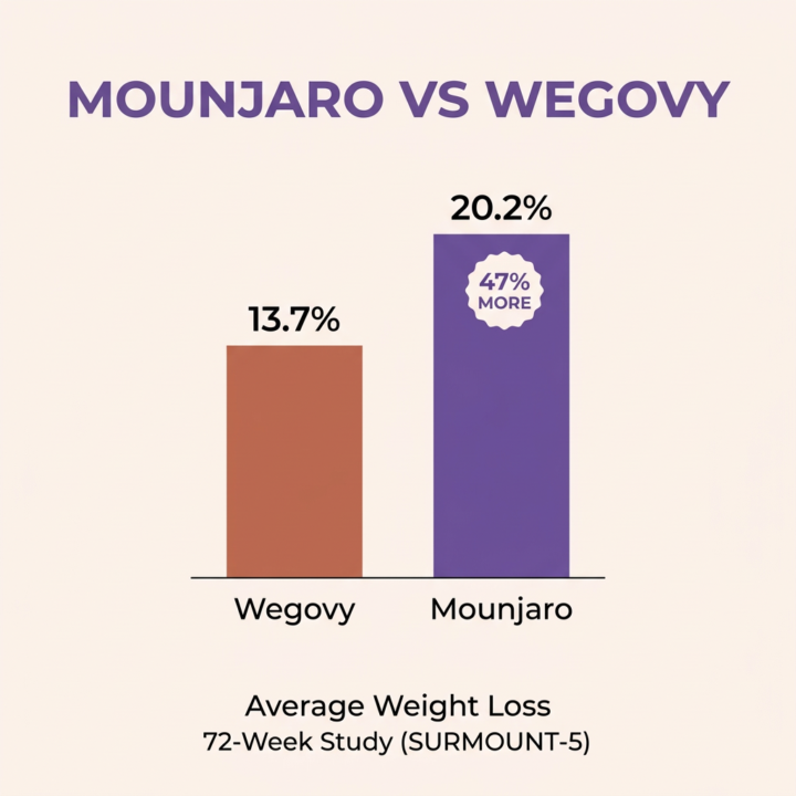 Perhaps most significantly, the SURMOUNT-5 head-to-head trial compared Mounjaro directly to Wegovy (semaglutide). Mounjaro produced 47% greater relative weight loss — an average of 20.2% compared to 13.7% with Wegovy at 72 weeks.