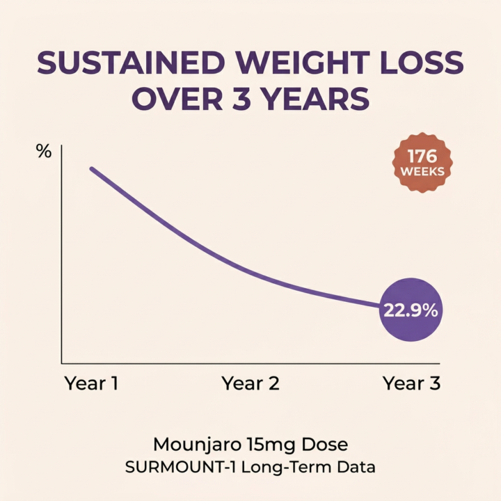 In November 2024, Eli Lilly published three-year data from SURMOUNT-1 showing sustained weight loss of 22.9% on the 15mg dose through 176 weeks of treatment. This wasn’t short-term results that disappeared when the medication stopped. This was sustained, meaningful weight reduction maintained over three years.